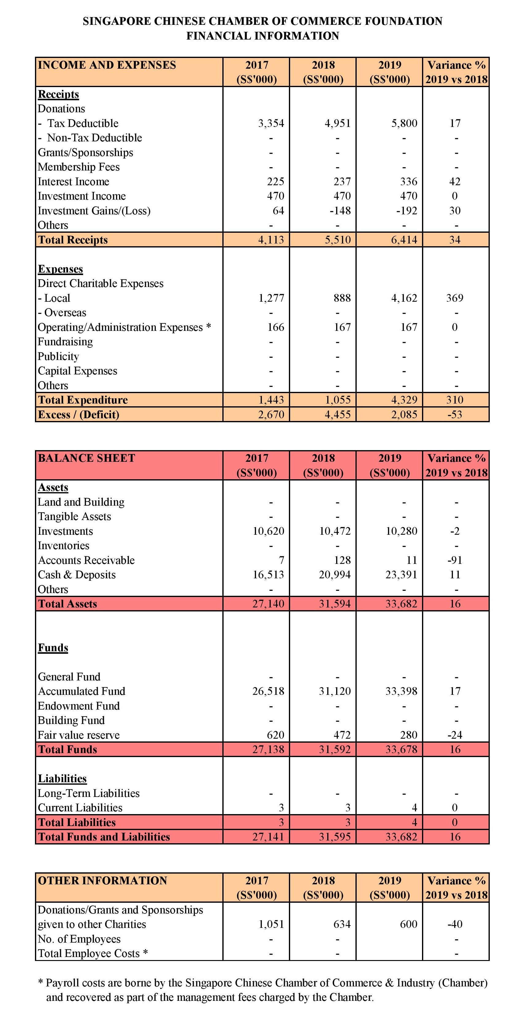 Singapore Chinese Chamber of Commerce Foundation (Foundation) was incorporated on January 27 1966 as a company Limited by guarantee and not having a share capital. It is an approved institution of a public character (IPC) and its IPC status was extended for a period of three years commencing from 01 January 2021 to 31 December 2023.