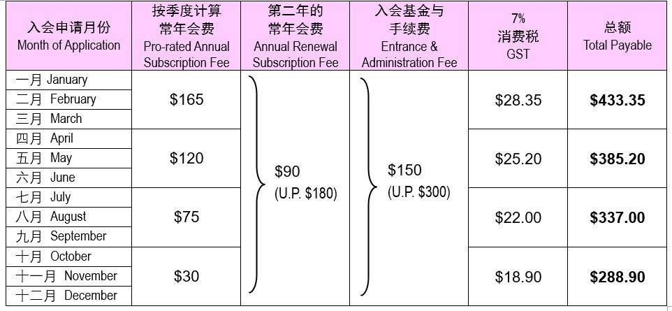 Please note that the annual subscription fees are pro-rated quarterly for the first year. Membership will expiry at end Dec of the following year. As applications will only be approved at the Council meeting held at each month end, applicants will officially become members in the following month. (e.g.: Applicants in January will only need to pay the 1st quarter’s fee and officially become members in February) Entrance and administration fees are one-time charge only.