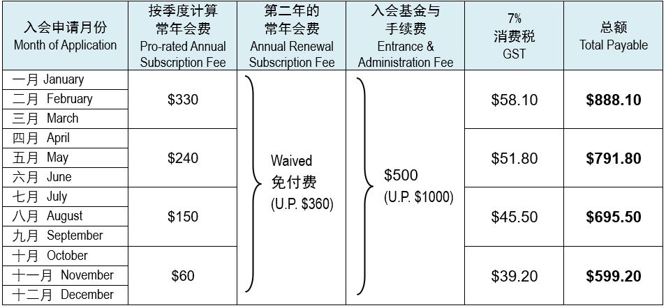 Please note that the annual subscription fees are pro-rated quarterly for the first year. Membership will expiry at end Dec of the following year. As applications will only be approved at the Council meeting held at each month end, applicants will officially become members in the following month. (e.g.: Applicants in January will only need to pay the 1st quarter’s fee and officially become members in February) Entrance and administration fees are one-time charge only.